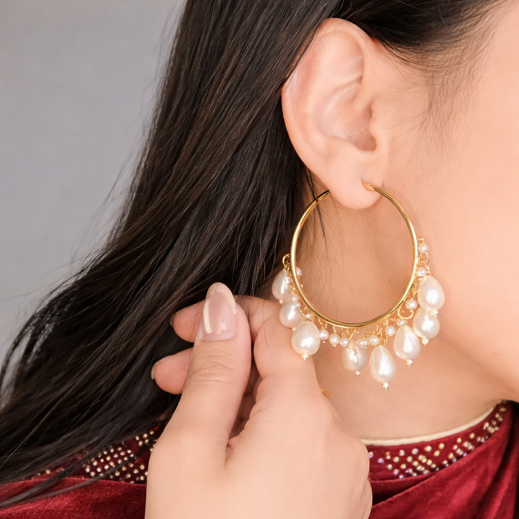 Sustainably crafted with high-quality materials, these gold hoops exude durability without compromising their classic beauty. The pearls are delicately set, ensuring both comfort and elegance every time you wear them.