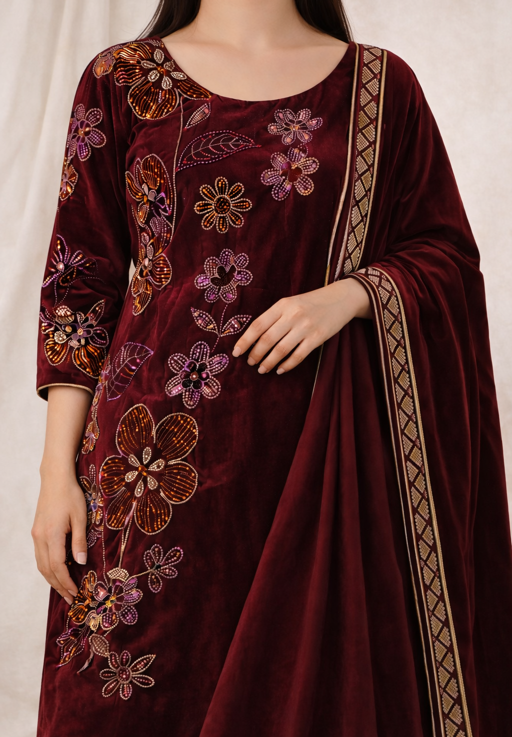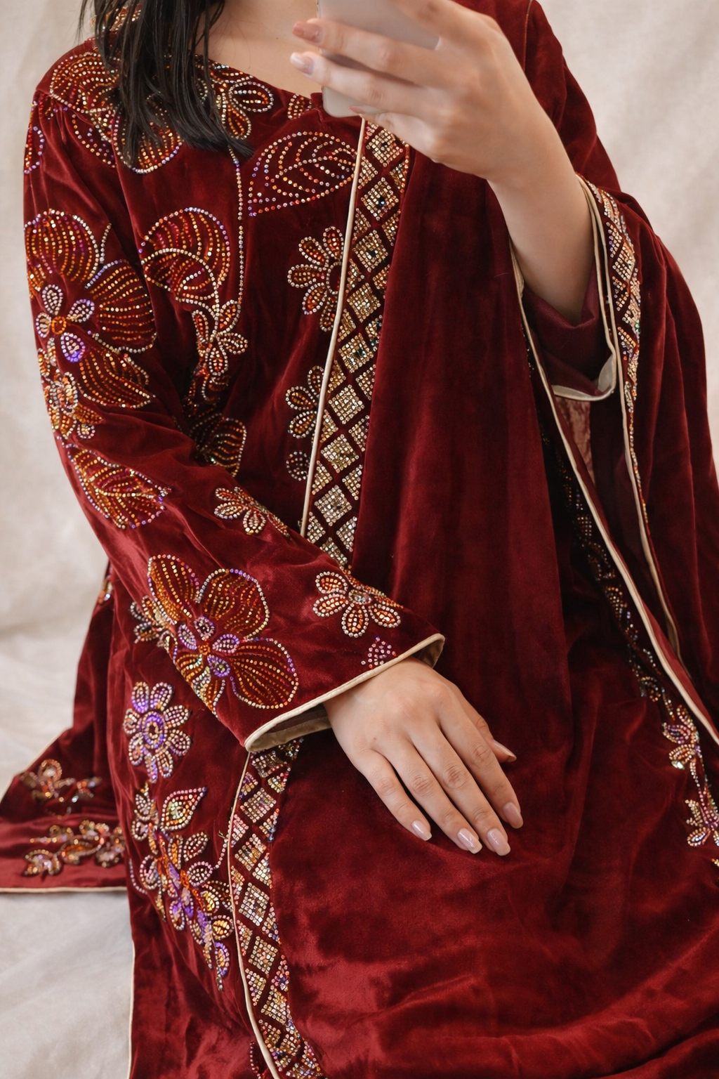 Intricate maroon velvet dress embroidery